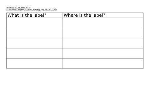 Labels lists and captions year 1. PDF KM C284e-20150324161638 Labels, lists and captions Lesson 3 More about pets Year I Non-fiction WALT Write sentences with a capital letter and a full stop. Possible learning outcomes To be able to read and write sentences and to use them as captions for their own work. To be able to pick out sentences in printed text and to recognise the idea conveyed by them. Lewisham Literacy Strategy Year One: Term One Year 1 : Term 1: Lewisham Literacy Strategy. Range: ... Captions and Labels: Week 1 (1) Text Level. T12 to read and use captions, e.g. labels around the school, on equipment; T14 to write captions for their own work, e.g. for display, in class books; Sentence Level: DEW pages 78-82 ... English Unit: lists, labels and captions | Burscough Village Primary School Year 1 - Miss Perkins. Gallery. English Unit: lists, labels and captions. Maths: Counting and playing with numbers. Topic: Magical Me. Autumn Seasonal observations linked to English & science. Our Curriculum. › teaching-resource › lists-labels-andLists, labels and captions planning Year 1 | Teaching Resources File previews. docx, 37.58 KB. notebook, 15.98 MB. A weeks literacy planning for the literacy topic 'Lists, Labels and Captions' suited for Year 1. A notebook is also attached. Tes paid licence How can I reuse this?
