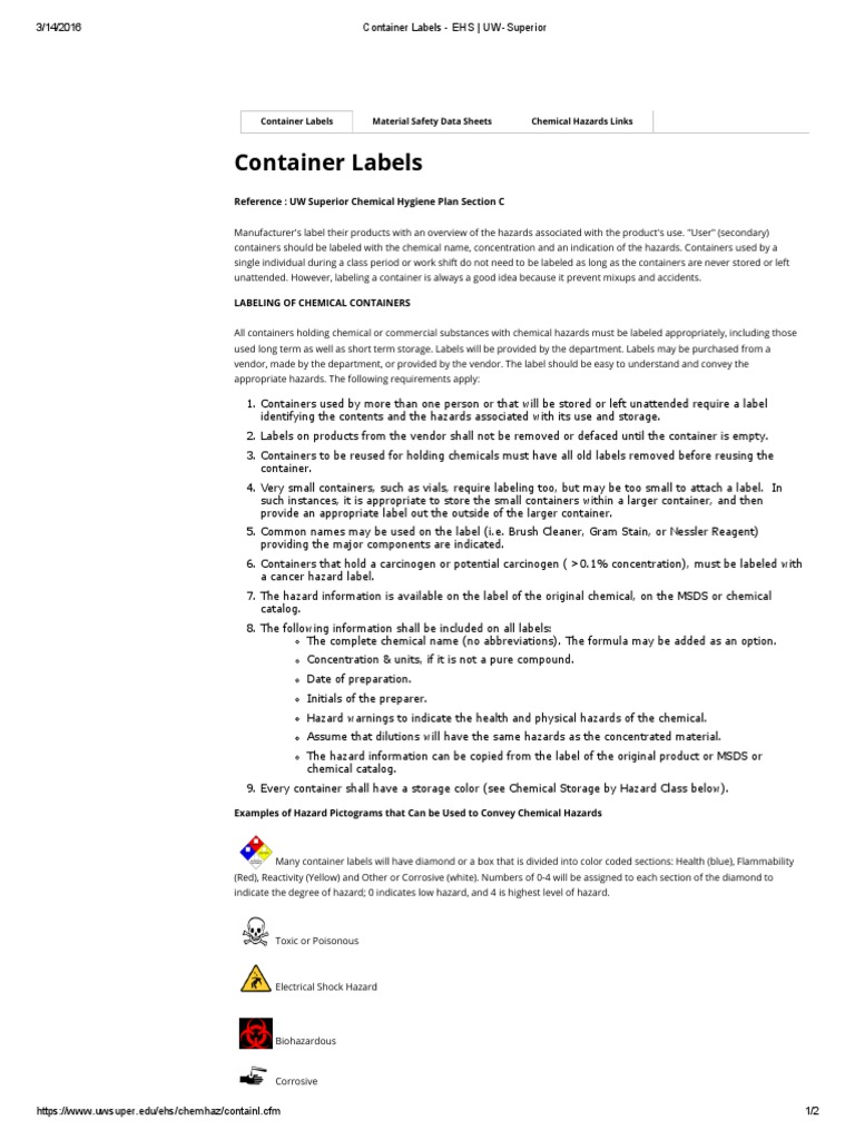 Standard labels for chemical containers. PDF ENVIRONMENTAL HEALTH & SAFETY Chemical Container Labeling Summary of OSHA standards and labeling requirements for Hazardous Chemical Containers Laboratory Areas & Use Non-Laboratory Areas & Use (machine shop, paint shop, etc.) Required Label Information 1 Manufacturer's container 2 Secondary container 3 Manufacturer's container Secondary container Chemical Identity 4 PDF HEALTH & SAFETY Chemical Container Labeling What type of label is needed on a hazardous chemical container? Hazardous chemical containers used within a Laboratory Area must follow the OSHA Laboratory Standard. Hazardous chemical containers used within a Non-Laboratory Area must follow the OSHA Hazardous Communication Standard. Summary of OSHA standards and labeling requirements for ... Chemical Container Labeling | OSHA HCS Labels | Safety Blog Chemical Container Labeling Posted by on November 7, 2019 The Hazard Communication Standard (HCS) describes chemical labels as information provided through a group of written, printed, or graphic appropriate elements concerning a hazardous chemical. These should be that placed on the immediate container of a hazardous chemical. Chemical Container Labeling - Environmental Health ... Chemical Container Labeling Chemical Container Labeling In accordance with OSHA's Hazard Communication Standard, manufacturers, importers or distributors of hazardous chemicals must follow specific container labeling requirements when their product are shipped in commerce.