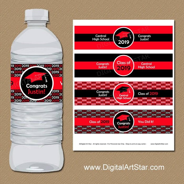 Amazon.com: 50 Pcs Graduation Labels Stickers Water Bottle Wrapper ... Proper Size to Fit Most Bottles: these graduation water bottle labels measure approx. 5 x 21.6 cm/ 2 x 8.5 inches, suitable for most of the water bottles; You can check the sizes before order and select the right sizes Graduation Water Bottle Labels - Free Templates | SheetLabels.com® Graduation Water Bottle Labels (888) 391-7165 Graduation Water Bottle Labels Your special someone is graduating, and what better way to celebrate the experience than to get awesome looking graduation water bottles for everyone! Professional Design Review Quality Guarantee Fast on-time delivery Categories Business Personalized Birthday Weddings Graduation Water Bottle Labels - Etsy Printed Waterproof Graduation Water Bottle Labels, Congratulations, Class of 2022, red, orange, blue, green, school colors, personalized BestWishesBoutique (3,488) $9.99 2022 GRADUATION LABEL with Photo Water Bottle Labels OR Birthday Digital Files College Graduation - High School Graduation LoveYourDesign (800) $6.95 32 Free Water Bottle Label Templates For Any Occasion Graduation Water Bottle Label Templates Show your graduate how proud you are with a party and full-fledged decorations. Customize the designs below to match their school colors, include their name, and tout their graduation year. Seeing friends and family cheers with their personalized water bottles will be a memory to cherish. Grad Cap